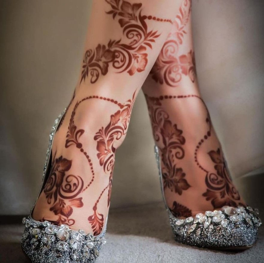 This project features henna designs combined with floral elements, including bouquets, roses, and floral patterns on feet and hands.
